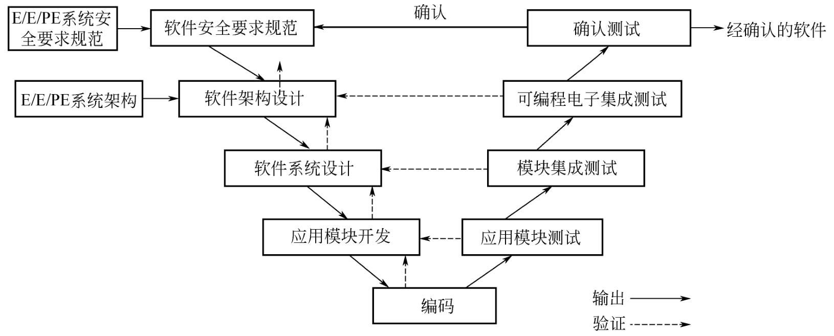 正像E/E/PE安全相關係統的開發有總體安全生命周期一樣,軟件也遵循有效的生命周期發展過程。圖8.1展示了軟件係統性能力和開發生命周期,即V模型。它是很多不同的軟件開發模型之一。可以根據項目的安全完整性要求和複雜性對V模型進行步驟合並。V模型描述了一種自上而下的軟件設計和測試程序。V模型中的每一方框的內容都需要確認和驗證。下麵簡述V模型中各個程序框的工作內容。