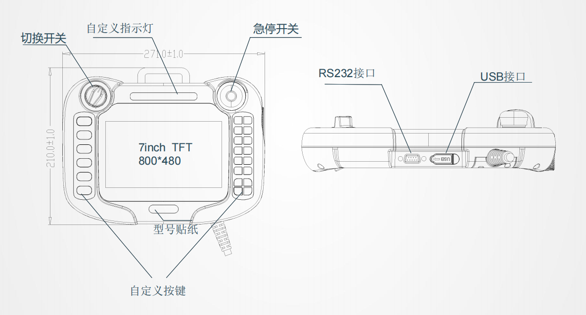 HT0705(組態HMI係列),廣泛應用於各種自動化設備,與傳統HMI不同,它具備手持可移動+按鍵特點,支持二次開發編程,用戶簡易教學即可上手開發界麵。通過組態軟件開發畫麵樣式,滿足界麵客製化需求。人機界麵製作全部由上位機軟件完成,HMI下載工程即可運行。